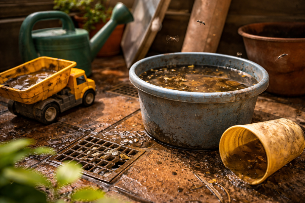 Aquí está el fallo real de muchas casas: no hace falta tener un jardín abandonado para tener un problema. Basta con una terraza donde queda agua tras la lluvia, un cubo olvidado, un sumidero sucio, un plato de maceta con agua varios días o un recipiente exterior que nadie vacía con frecuencia. Todo eso parece poca cosa, pero junto puede ser suficiente para que el problema arranque antes de que llegue el calor fuerte.