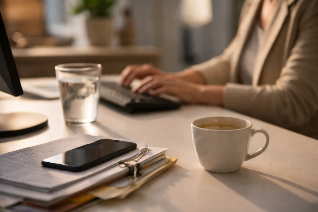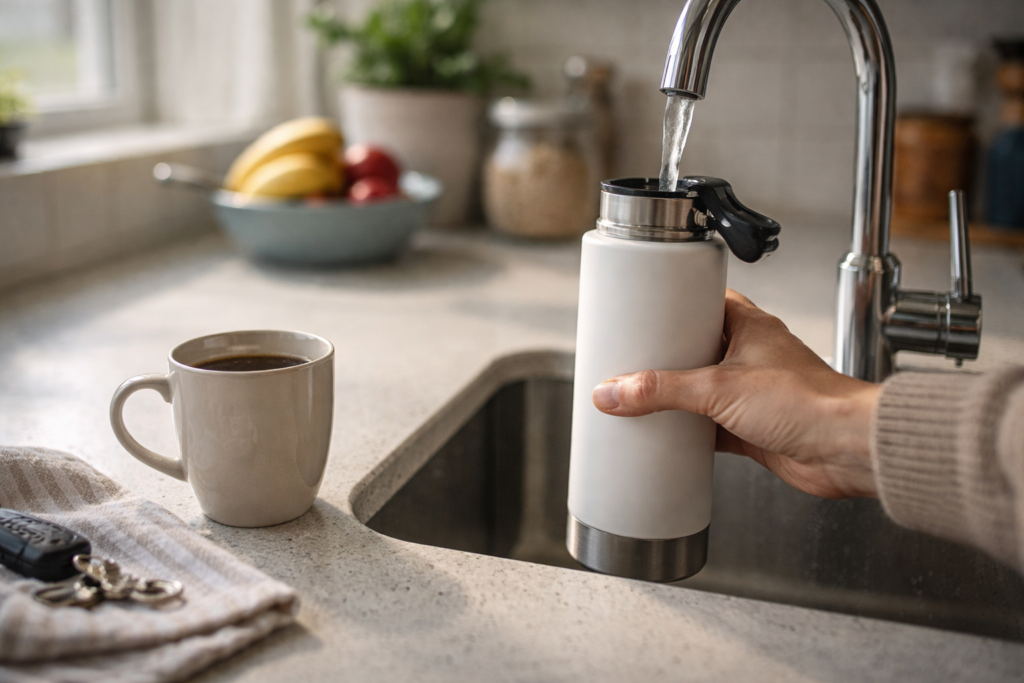 Paso 2 — Un vaso al levantarte antes del café El cuerpo lleva entre seis y ocho horas sin agua. El primer gesto al levantarte es un vaso de agua antes del café. No en lugar del café. Antes. Son 250 mililitros automáticos cada mañana.