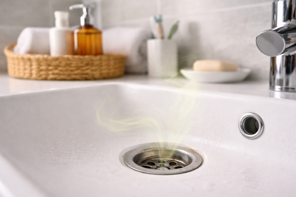 Este es probablemente el caso más común. El baño parece limpio, pero cuando entras después de un rato cerrado notas un olor raro, como a cañería, a humedad o a fondo sucio. Muchas veces el origen está en el desagüe del lavabo o en el de la ducha.